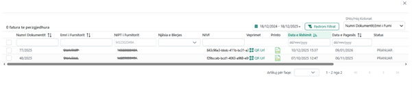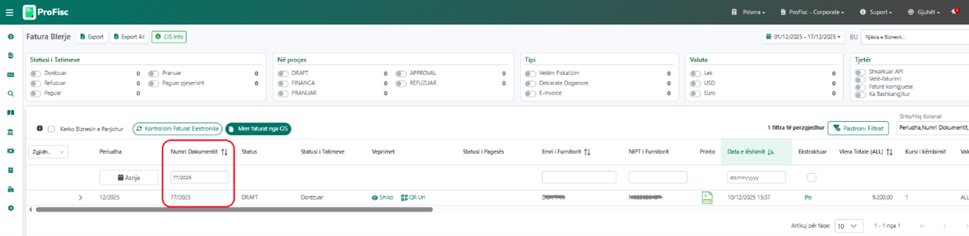 Numri i Dokumentit Numri fiscal I fatures Plotesohet automatikisht