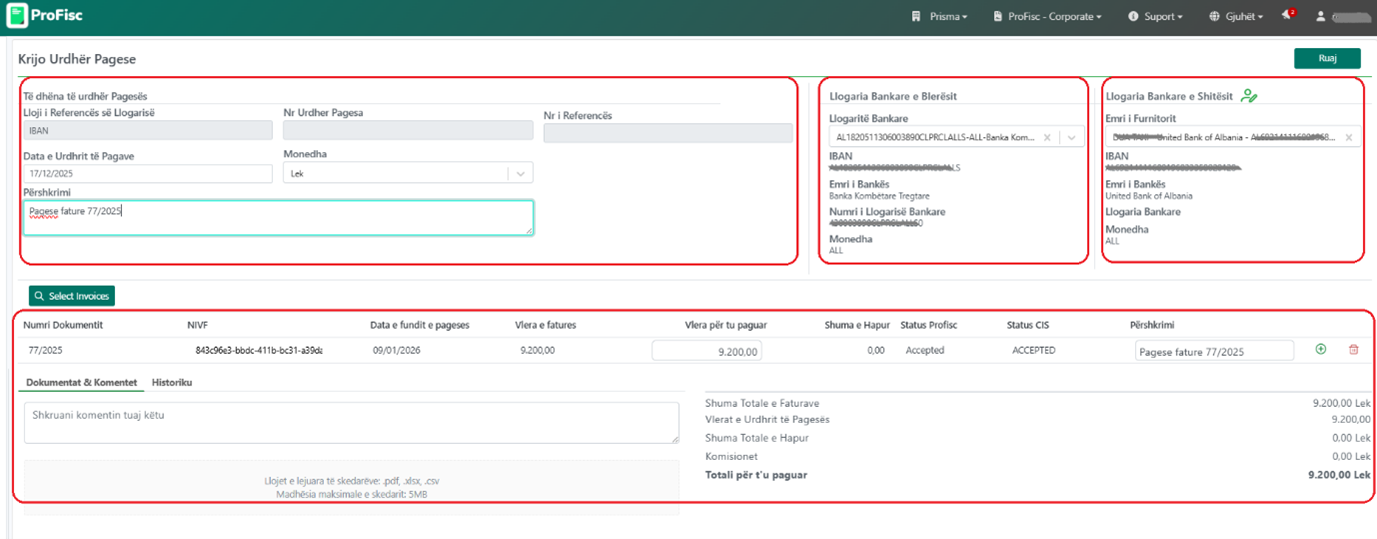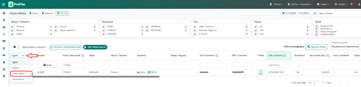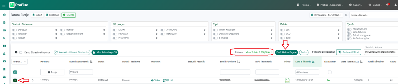 Gjithashtu ne menune e faturave te blerjes ne Profisc,  fatura e blerjes qe sapo u pagua merr status Faqjase = “In Payment” qe do te thote se per kete fature eshte iniciuar nje urdher pagese.