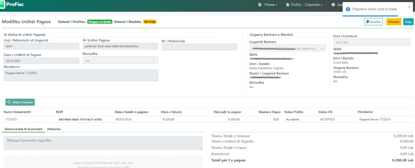 3. Dergo ne Banke – Urdher Faqjasa dergohet ne Banke (aprovim i dyte). Statusi ne Profisc eshte Derguar ne Banke ndersa statusi i Bankes eshte Ne Pritje